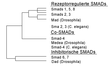 The name of Smad-proteins is derived from the genes encoding them. They had been identified in genetical studies at drosophila and C. elegans for the first time. The drosophila-gene is designated as Mad (Mother against decapentaplegic), the gene in C. elegans as Sma (Small body size). The combination of these two designations creates the name "Smad". Structural and functional three sub-families of the Smad-proteins are distinguished (figure 1), for all three of which a similarly strong preserved basic sequence is characteristic.