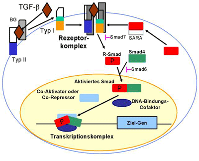 The cellular signal path of TGF-β is very complex: TGF-β links to the membrane-bound type-2-receptor and allows thus the adsorption of the type-1-receptor. Then TGF-β activates the kinase function of the type-2-receptor with subsequent stimulation of the kinase-function of the type-1-receptor. The so-called receptor-Smad-proteins (Smad 2 and Smad 3) link to the receptor complex and are phosphorylized by the type-1-receptor. The Smad- anchor protein SARA enhances the adsorption of the R-Smads. The phosphorylized R-smad-proteins form a complex with the cooperative Smad 4. It is able to penetrate the nucleus. Here the activated R-Smads adsorb at DNA-promoters and/or transcription factors and control transcription processes. The inhibitory Smad-proteins (Smad 6 and Smad 7) antagonize the adsorption of the R-Smads at the receptor complex or at Smad 4 (please refer for further explanations to the text).
