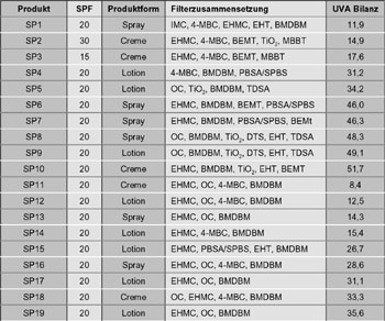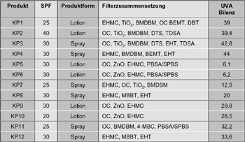 performance at the same time from long-term light related damage. In total 31 sun protection products had been purchased in chemist's shops, in grocer's shops and pharmacies for the tests. Subject to testing were body lotions, facial creams and sprays with varying UV filter systems and SPF values between 15 and 40; thereunder 19 standard and 12 sun protection for children. On most products the UVA-/UVB wideband protection according to the Australian standard AS 2604 was indicated. Only in rare cases the feature of a particularly well-balanced or equilibrated relationship of UVA and UVB protection - without reference to the Australian standard - has been claimed. Detailed information regarding the SPF, product category as well as filter properties are to be found in table 1 and table 2.