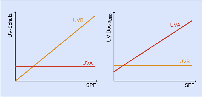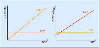 The product declaration in view of UVB protection is effected consistently based on the light protection factor (LSF, LF or SPF) which is determined according to an in-vivo method standardized by COLIPA (1). The consumer is familiar with the declaration and pays regard to it when selecting a product. The situation is to a much lesser degree stringent regarding UVA radiation and UVA protection, although intense research activities of the last years were equally able to definitely prove a damaging effect of the long-wave UV rays. Primarily the focus is set on extrinsic skin ageing (2). The light aging of skin (photo-aging) leaves visible traces - also visible for the consumer. Moreover, UVA-radiation has been identified as triggering factor for light dermatoses. Alike, evidence for the damage of the cell nuclei of skin cells has been proven (3). Nevertheless, to date the degree of UVA protection has been of minor importance in the product selection. The orientation by the consumer is rendered additionally difficult by the fact that the determination of the degree of the UVA protection and its pertinent declaration is not standardized. Most producers adhere to the stipulations by the Australian standard (4) when determining the UVA protection. Its requirements are met as soon as a sun protection agent reduces the transmission in the area of 320 - 360 nm by at least 90 %. The Australian standard does not provide a further differentiation above this threshold level. This is to ensure an adequate UVA protection when adhering to this standard at products with low SPF, with increasing SPF however, the UVA protection may stagnate at a constant level without infringing the standard; the UVA protection thus does not necessarily increase with the UVB protection. This leads to the fact that until reaching of the erythema threshold with increasing SPF of the sun protection products used, an increasing UVA dose affects the skin (illustration 2). Enlarged version This dissatisfactory situation lead in the past to a development of tools in national and international dermatological working groups parallel to the development of product concepts allowing for a higher UVA protection rendering possible a differentiated measurement and labelling of the UVA protection. A first step in direction of an international harmonized way of proceedings, a new German industry standard (DIN 67502) (5) has been established since February 2005. The specific feature of the method described in this standard is that the UV protection is first of all determined in vitro and subsequently a relationship is established to the in vivo light protection factor of the test product and the measuring value obtained. According to the principle