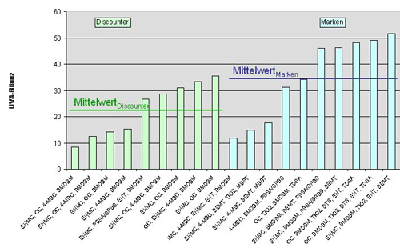 balance value of 35.6. Enlarged version The difference in quality of tested sun protection products for children was even more pronounced in view of the UVA protection performance (illustration 4). In this group all products by research-active producers excel by higher UVA balance values in contrast to the products from discount stores. The best brand protects more than eight times better with a UVA balance value of 51.7 from UVA rays compared to the discount product with the poorest UVA balance value of only 6.1. On overage the protection of sunscreen agents for children by brand producers is twice as effective as comparable products from discount stores: children products of brand producers obtained a mean value for UVA protection of 41.3. The mean value for children products available at discount stores against it only reached 19.7.