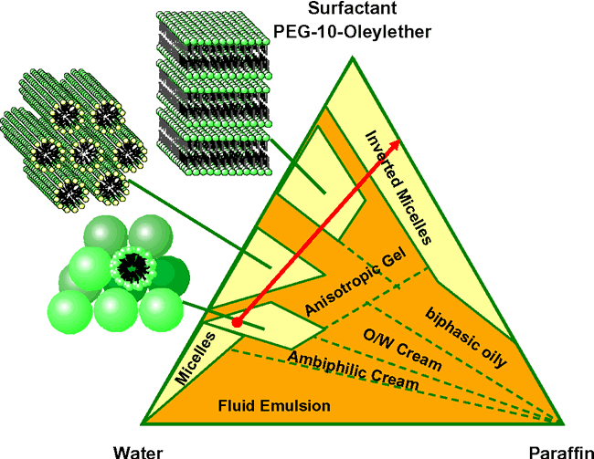 Surfactant gels Surfactant gels are lyotropic liquid crystals. They form by association of hydrated or solvated surfactant molecules. Depending on the structure and concentration of the surfactant differently arranged liquid crystalline phases may form (Fig. 6). Cubic and hexagonal liquid crystals behave clearly visco-elastic, showing the rheological behaviour of both solid and liquid. In common with most typical gels, they possess a substantial yield stress. Cubic surfactant gels react highly elastic upon mechanical agitation. As their oscillating frequency is within the acoustic range, they are called ringing gels. Lamellar liquid crystals are regularly arranged in one dimension and are thus more fluid than cubic or hexagonal phases. However, they are, although less pronounced, also visco-elastic. Surfactant gels seem to be interesting for topical use because they can potentially interact with the intercellular epidermal lipids. The colloidal structure of lamellar phases and the stratum corneum lipids is very similar. The interaction with the skin and the resulting penetration enhancing effect seems to be correlated with the high concentration of surfactants. This affects the structure of the epidermal lipids and thus increases the skin permeability. Lyotropic liquid crystals may also provide improved skin care benefits. Conversely, the irritation potential may also increase with increasing surfactant content. This requires a careful of benefits and risks.. Furthermore it must be considered, that the water content after dermal application will change. Within a few minutes the water content reduces dramatically. This will alter the state of surfactant gels according to their phase behaviour (Fig. 7). When, for example, a cubic phase is applied to the skin it turns into a lamellar phase and ends up as an inverted micellar system at a low water content. Whereby several multi-phase transitional states are also observed. This metamorphosis of the vehicle is known for a longer period, however, its influence on the interaction of the vehicle with the skin is only little investigated so far. Hydro-dispersion gels Hydro-dispersion gels are dispersed systems consisting of a hydrophilic continuous phase and a lipophilic dispersed phase. Usually, hydro-dispersion gels are oil-in-water emulsions with a content of liquid lipid phase between 2 and 20 %. In contrast to classical emulsions, the required stabilization is not provided by the addition of traditional emulsifiers but by means of suitable macromolecules (Figure 8). This is stressed when such formulations in particular in the field of sun care products are called "emulsifier-free". Apart from the interfacially stabilized hydro dispersion gels there are products on the market where relatively small amounts of lipid are solely stabilized by the viscosity enhancing effect of the added polymer. Such "quasi"-emulsions are also termed "Balm". The ingredient list of an appropriate formulation is given in Table 4. The physical stability and an adequate shelf life are obtained through finely dispersing the lipids. This measure and the yield value of the external phase reduce droplet mobility and thus effectively prevent creaming and coalescence of the oil droplets. Even persons with sensitive skin tolerate well hydro-dispersion gels. Their application can be recommended on normal or seborrhoeic skin in particular when large amounts of alcohol are added for antimicrobial preservation. The stabilizing action can be categorized into two classes : (1) Stabilization by enhanced viscosity (so-called "quasiemulsions") (2) interfacial stabilization. In practice, often either of these two mechanisms is responsible for the storage stability with one component being more dominant. Polymers are frequently added to increase the stability of an emulsion by thickening and adding yield value to the continuous phase. Such formulations where no interfacial activity is involved in the stabilizing action of the polymer are obtained when solely polyacrylic acid is used as a stabilizer. In the literature, such preparations are termed "quasi"-emulsions. Appropriate products on the market, often named "balm", usually consist of considerably small amounts of lipids dispersed in a hydrogel. The physical stability and an adequate shelf life are obtained through finely dispersing the lipids. This measure and the yield value of the external phase reduce droplet mobility and thus effectively prevent creaming and coalescence of the oil droplets. The ingredient list of an appropriate formulation is given in Table 2. Table 2: Qualitative Formula of a Lipid-containing Sun Protection Gel ("Pseudo emulsion")