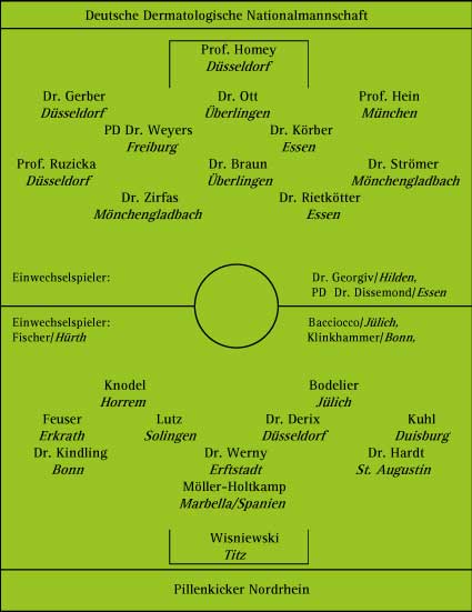 To be stressed owing to outstanding performance are the double scorer Ralf Bodelier on the side of the pharmacists, the agile midfield player Harald Feuser as well as Jan Möller-Holtkamp who united the defence of the pill kickers also in ticklish situations and excelled by establishing of smart game structures. On the side of the dermatologists, in particular private lecturer Dr. Weyers and Dr. Körber attracted attention due to their tireless performance and commitment besides goal keeper professor Homey. Moreover, the standards and crosses by Dr. Braun stood out positively arousing again and again hazards in the adversarial penalty area.