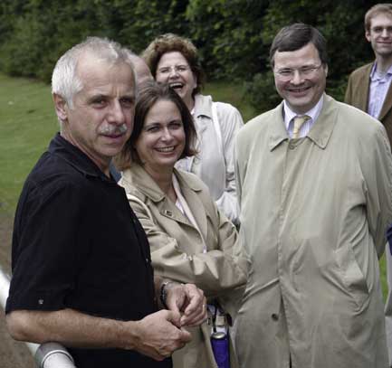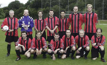 Ten years' GD First interdisciplinary football comparison between dermatologists and pharmacists Pill kickers North-Rhine winning 3:1 versus the German dermatological national team Report by Jan Kresken, Münster A novelty on the football ground came about at the sport park Süchtelner Höhen in Viersen on 2nd July 2005. For the first time a football match between dermatologists and pharmacists took place on the occasion of the festive event of the ten-year establishing of the Gesellschaft für Dermopharmazie. The selection of pharmacists under the name "Pillenkicker Nordrhein (pill kickers North-Rhine)" won 3:1 after 80 minutes of hard but at all times fair contest against the German dermatological national team managed by the GD board member Dr. Dr. Thomas Ruzicka. The pharmacists thus assured the GD-jubilee cup which team captain Dr. Stefan Derix received in the course of the GD Jazz night. . In the course of a festive event on the occasion of the ten-year anniversary of the GD, an interdisciplinary football match took place for the first time encompassing dermatologists and pharmacists. In this match the German dermatological national team with its team captain professor Dr. Dr. Thomas Ruzicka (below right) had to admit defeat in the end with 1:3 against the pharmacist selection pill kickers North-Rhine after a 1:0 half-time leadership. The German dermatological national team which had been coached by the GD department head professor Dr. Matthias Augustin, Hamburg, instead of their owing to an injury at short notice hindered coach could only free themselves after ten minutes' play from the clasp of the pharmacists and were in particular dangerous by counterattacks and standards. Thus Jan Möller-Holtkamp, the vigilant defense organiser of the pharmacists was just about able to ward off at the goal line in the 10th minute after a tightly drawn corner by dermatologist Dr. Martin Braun, Überlingen. The dermatologists realized the first goal of the match in the 16th minute after a comparable situation: Dr. Braun performed again a corner at the short post from where a defender of the pharmaceutical team scored a goal untenably for goal keeper Uwe Wisniewski into the upper left corner of his own goal by employing the back of his head.