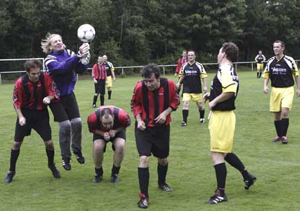 Pharmacists shocked from own goal Shocked from their own goal, the pill kickers withdrew for some minutes in their own half of the pitch whereas the dermatologists first of all restrained to keep their advantage. Therefore in the middle of the first half time most actions took exclusively place in the midfield whereas clear scoring changes on both sides remained scarce. Only starting from the 25th minute, the pill kickers became aware again of their offensive strength and had right off the bat numerous goal chances: a free kick by Christian Knodel, Horrem, duffed the goal of the dermatologists only curtly from a promising situation, the pill kickers passed up their best chance in the 32nd minute of the first half time when Peter Lutz, Solingen, missed the goal from the right side uncovered in front of goal keeper Homey after a flat throw-in by Ralf Bodelier, Jülich.