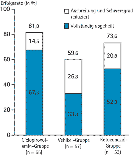 Die Erfolgsraten in der Studie 1 betrugen 81,8 Prozent in der Ciclopiroxolamin-, 73,6 Prozent in der Ketokonazol- und 59,6 Prozent in der Vehikelgruppe (Abbildung). Der Unterschied zwischen der Ciclopiroxolamin- und der Vehikelgruppe war statistisch signifikant (p = 0,013), während zwischen der Ciclopiroxolamin- und der Ketoconazol-Gruppe kein signifikanter Unterschied festgestellt wurde. Eine deskriptive Auswertung, bei der „Abheilung“ als alleiniges Kriterium für Behandlungserfolg definiert wurde, führte zu Erfolgsraten von 67,3 (Ciclopiroxolamin), 52,8 (Ketoconazol) beziehungsweise 33,3 Prozent (Vehikel), wobei auch hier nur der Unterschied zwischen Ciclopiroxolamin und dem Vehikel statistisch signifikant war (p = 0,00006).